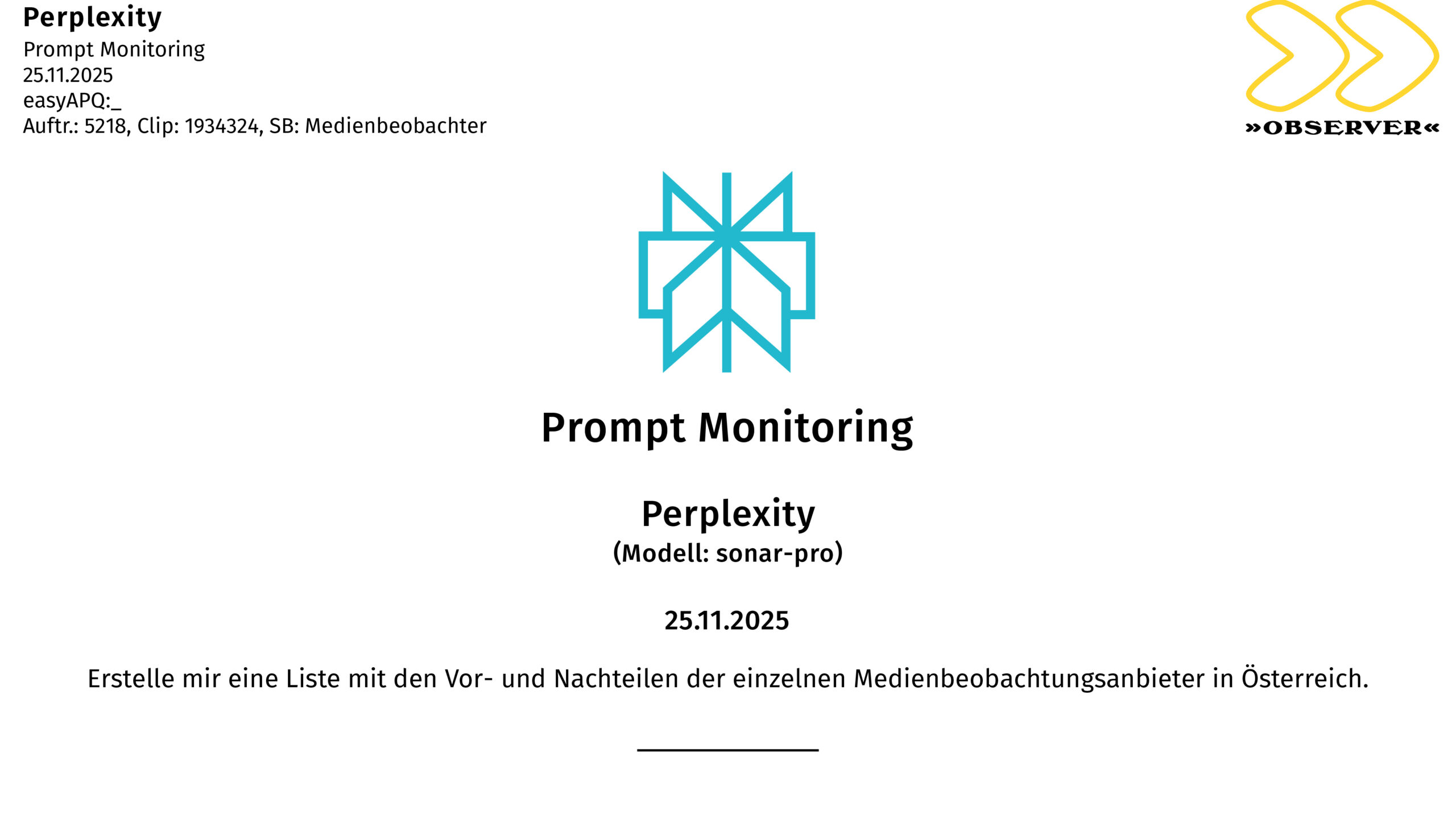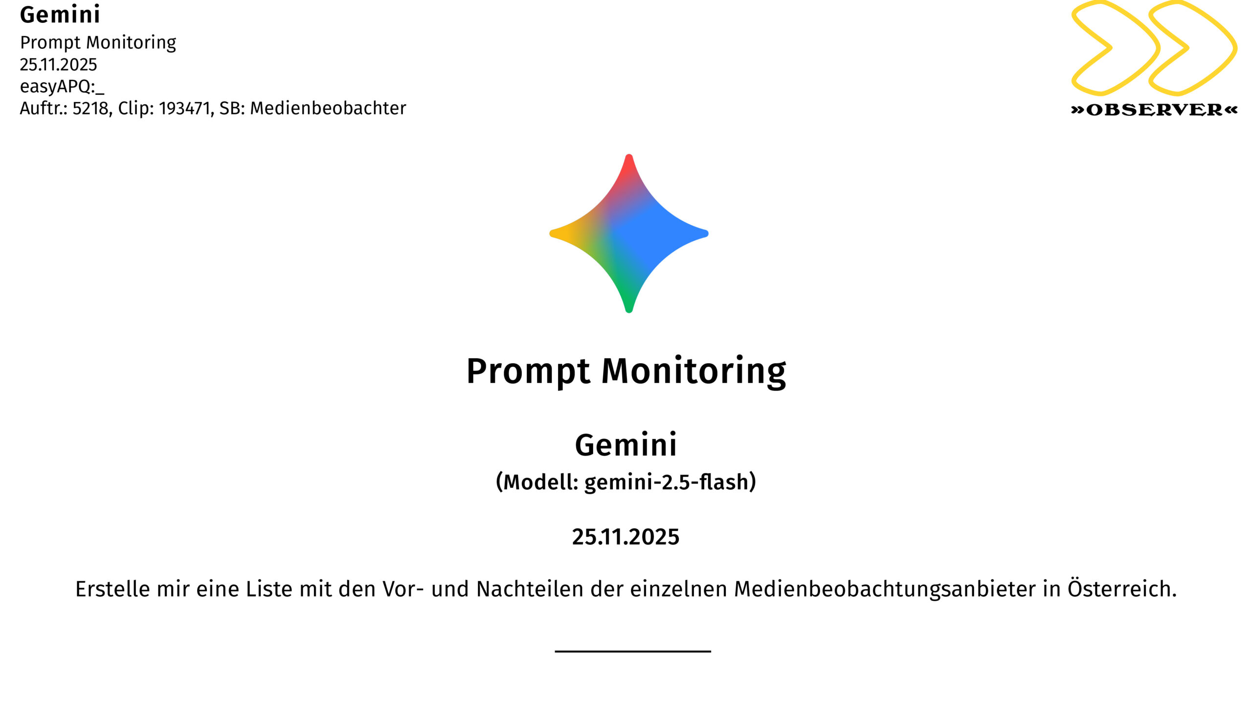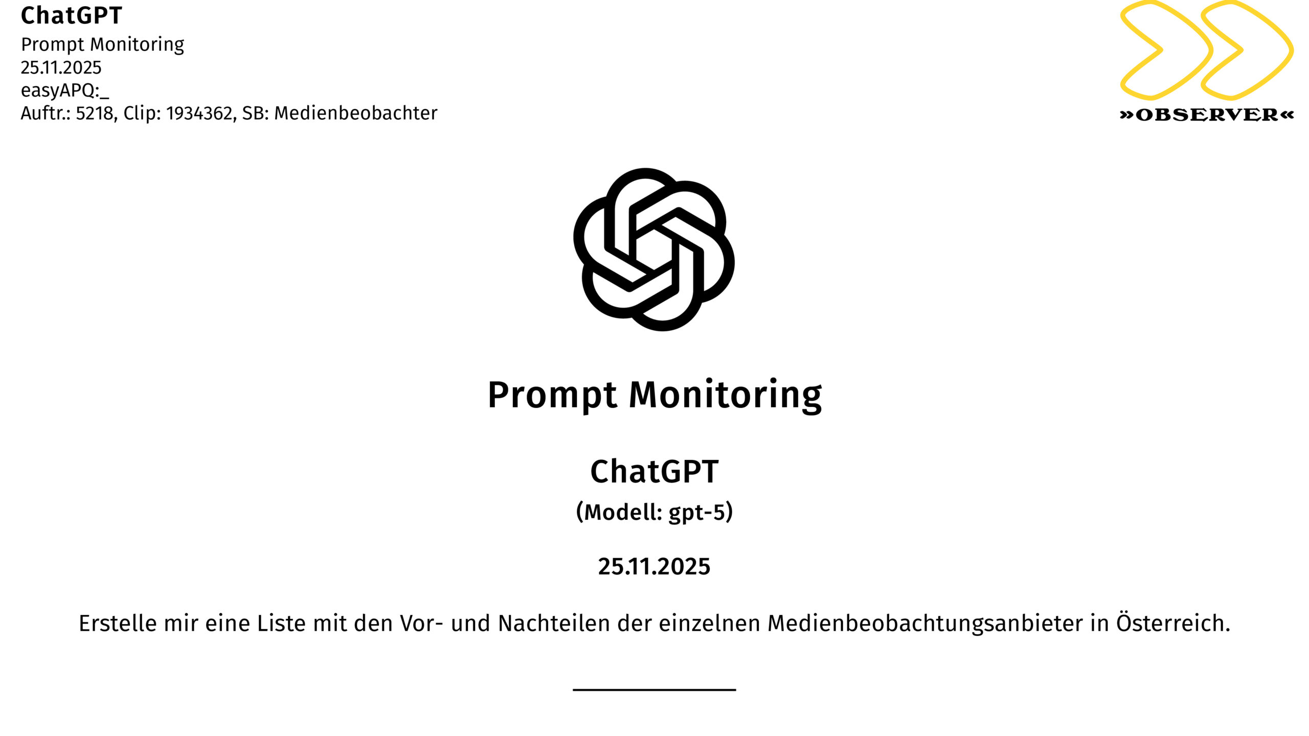 Schreiben Sie uns Ihre gewünschten Fragestellungen (Prompts) und Sie erhalten täglich, wöchentlich oder monatlich die Antworten der KI-Tools als Clippings in Ihre laufende Beobachtung integriert.